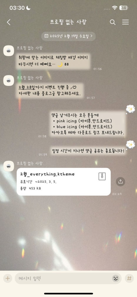 월간 테마를 다들 좋아해주셔서 감사합니다. 게시글마다 보너스 카톡 테마를 일정 기간동안 공유하고 있는데요. 기간이 지나 받지 못 하신 분들의 댓글 및 디엠 요청이 많았습니다. 다운로드 받지 못하신 분들은 아쉬워하지 마시고 재공유 기간에 꼭 다운로드 받아 사용해보시길 바랍니다. 🥰 공유 기간이 끝나면 게시글은 유지하되 첨부한 파일은 삭제합니다.