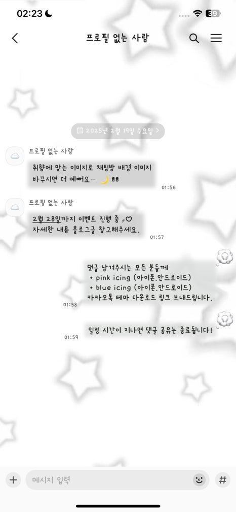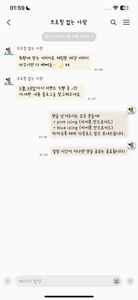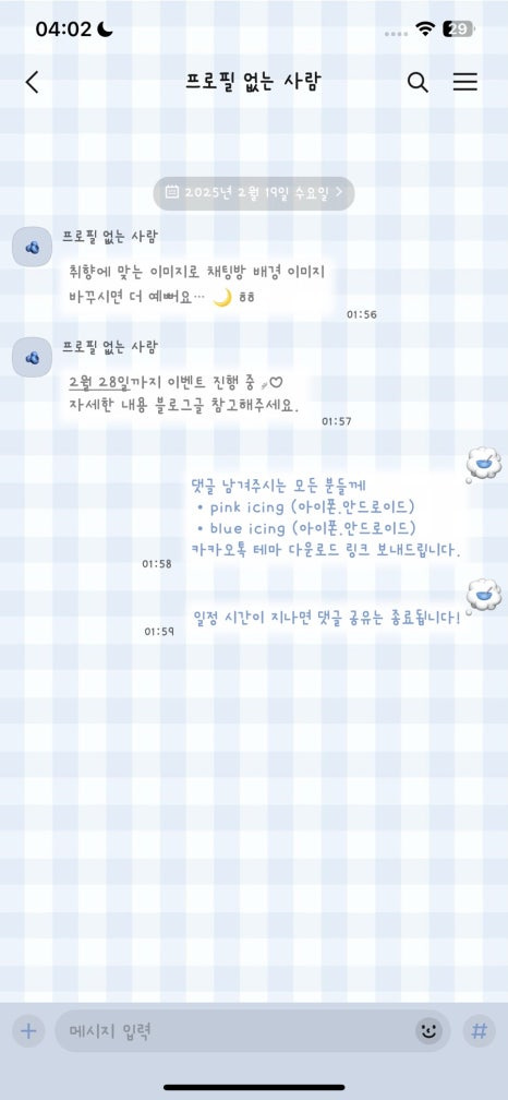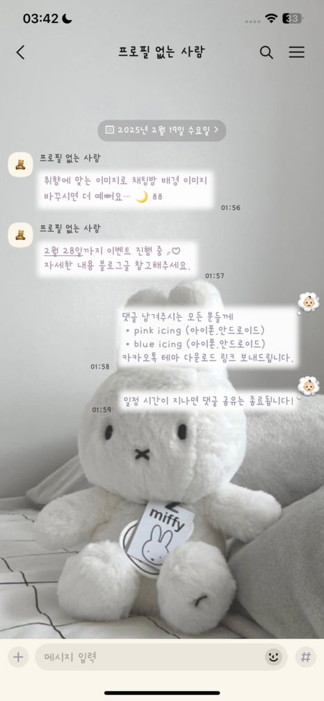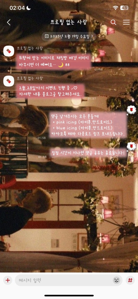 월간 테마를 다들 좋아해주셔서 감사합니다. 게시글마다 보너스 카톡 테마를 일정 기간동안 공유하고 있는데요. 기간이 지나 받지 못 하신 분들의 댓글 및 디엠 요청이 많았습니다. 다운로드 받지 못하신 분들은 아쉬워하지 마시고 재공유 기간에 꼭 다운로드 받아 사용해보시길 바랍니다. 🥰 공유 기간이 끝나면 게시글은 유지하되 첨부한 파일은 삭제합니다.
