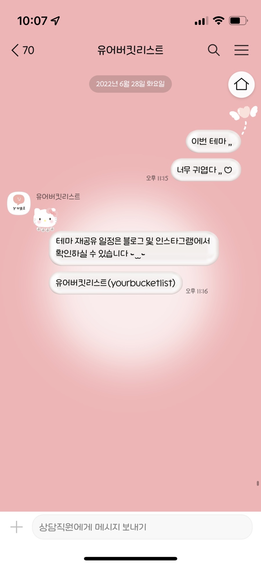 상대방 말풍선 (진주 목걸이 키티) + 나의 말풍선 (천사 날개 하트)
