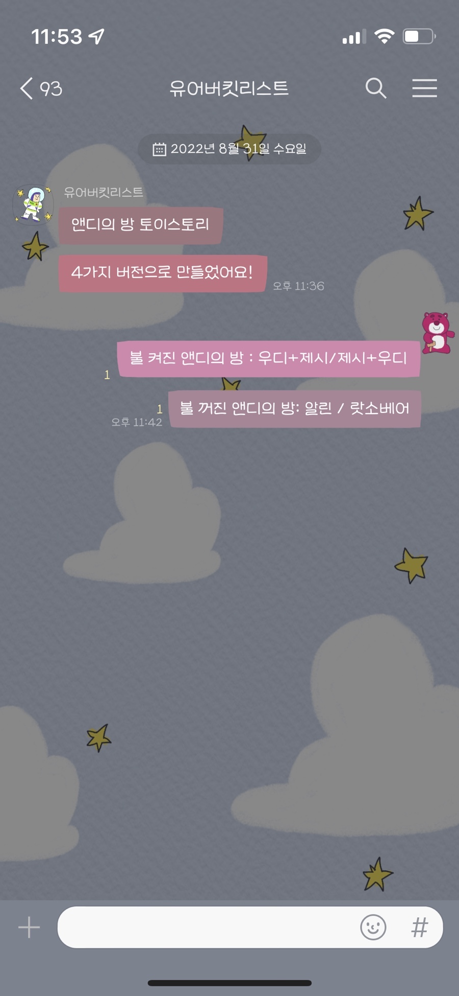 불 켜진 방에는 우디+제시 말풍선 테마입니다.