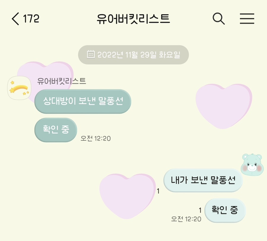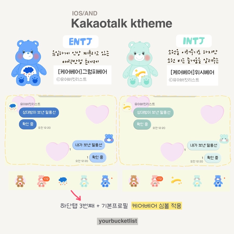 | [케어베어] MBTI 8가지 (펀샤인베어,시크릿베어,베드타임베어,굳럭베어,쉐어베어,카밍하트베어,데이드림베어,프렌드베어) 카카오톡 테마 (0) | 2023.03.03 |