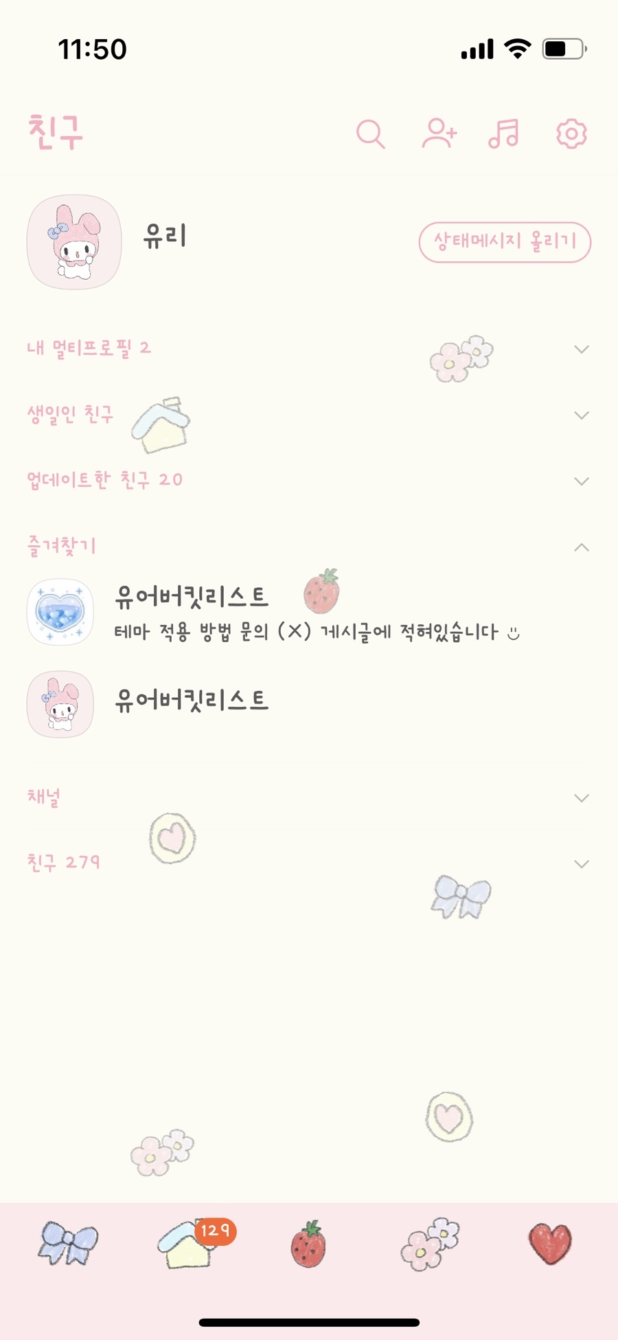 핑크색 배경 + 기본 프로필(마이멜로디)+ 말풍선 핑크색 밑줄만