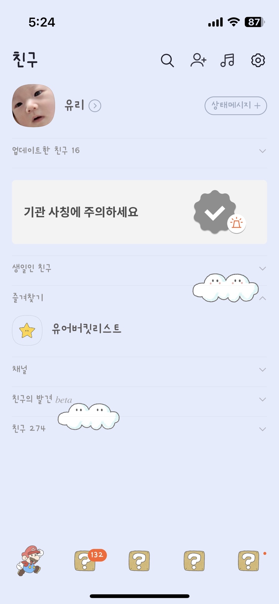 마리오가 물음표 박스를 머리로 치면 아이콘 나오는 하단탭으로 하고 싶었는데 깔끔하지 않은 느낌이라,, 누르면 일러스트 나오는 걸로 했어요 (* •︠ ̯ •︡) ㅎㅎ 볼터치 찍힌 아이콘들 사랑스러븜