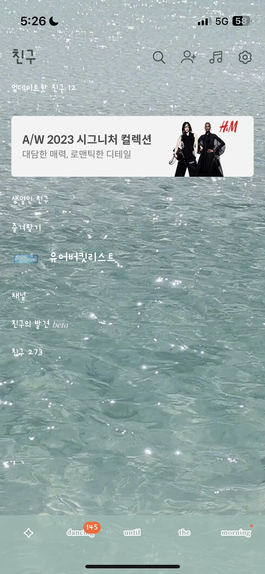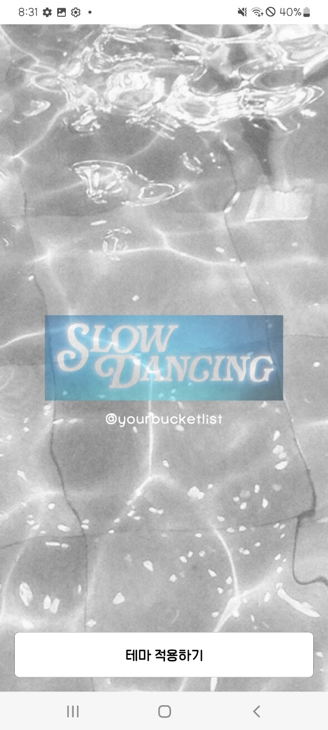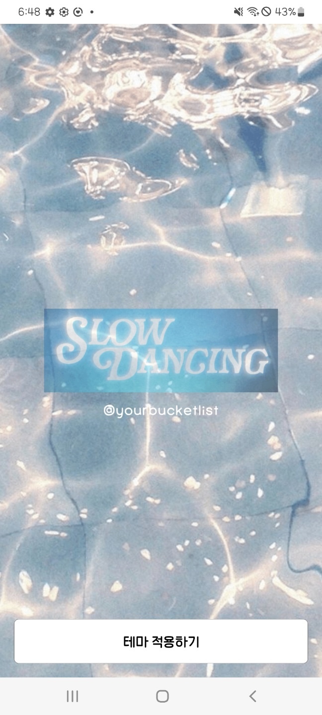 🗯️ 밝은 다크 계열의 물빛 배경이고 하단탭은 Slow dance 가사 한 소절을 넣었어요.