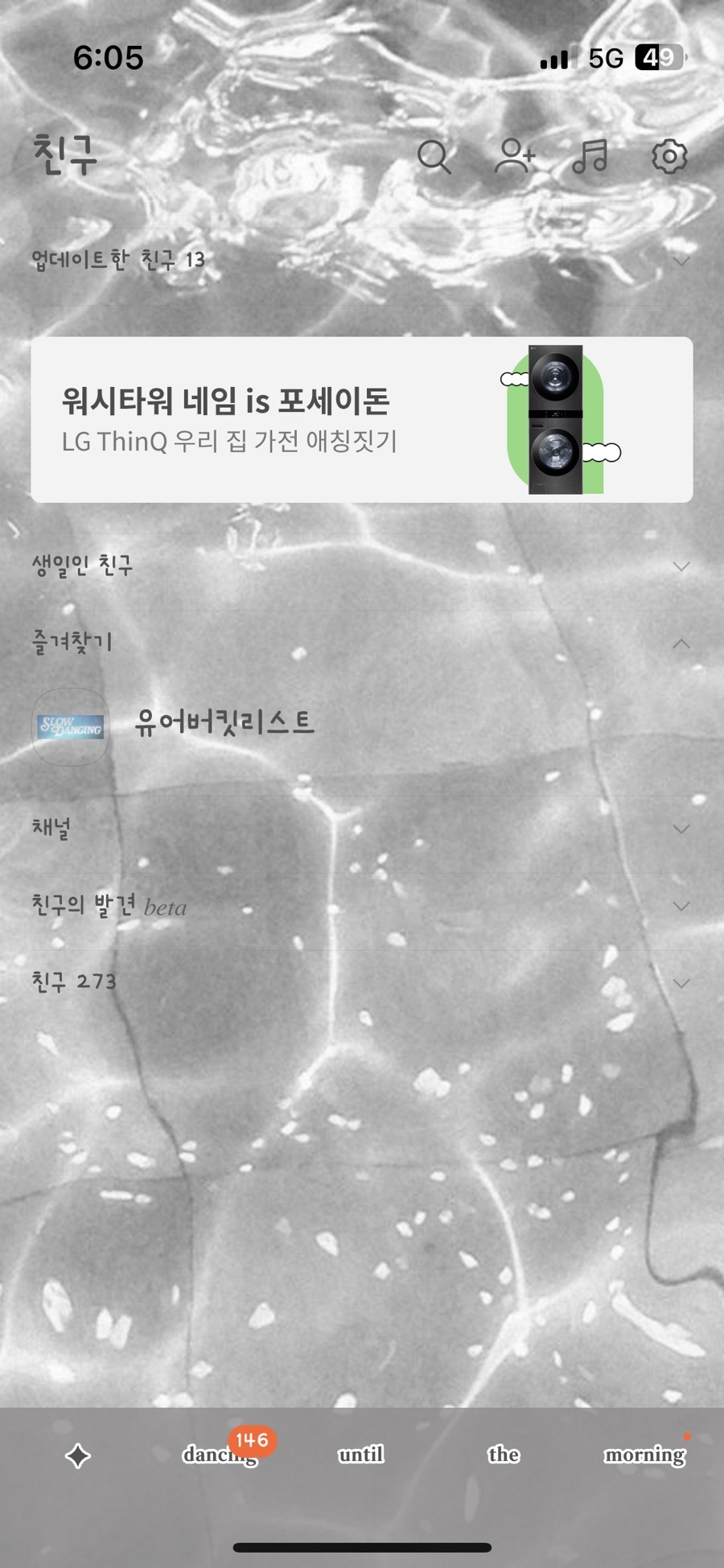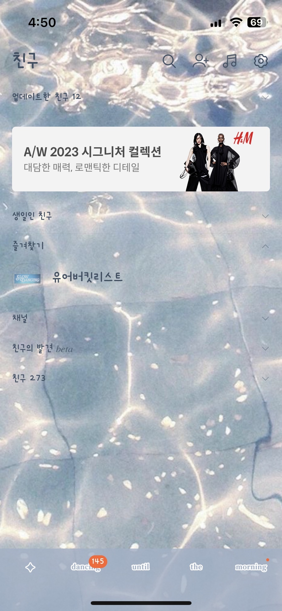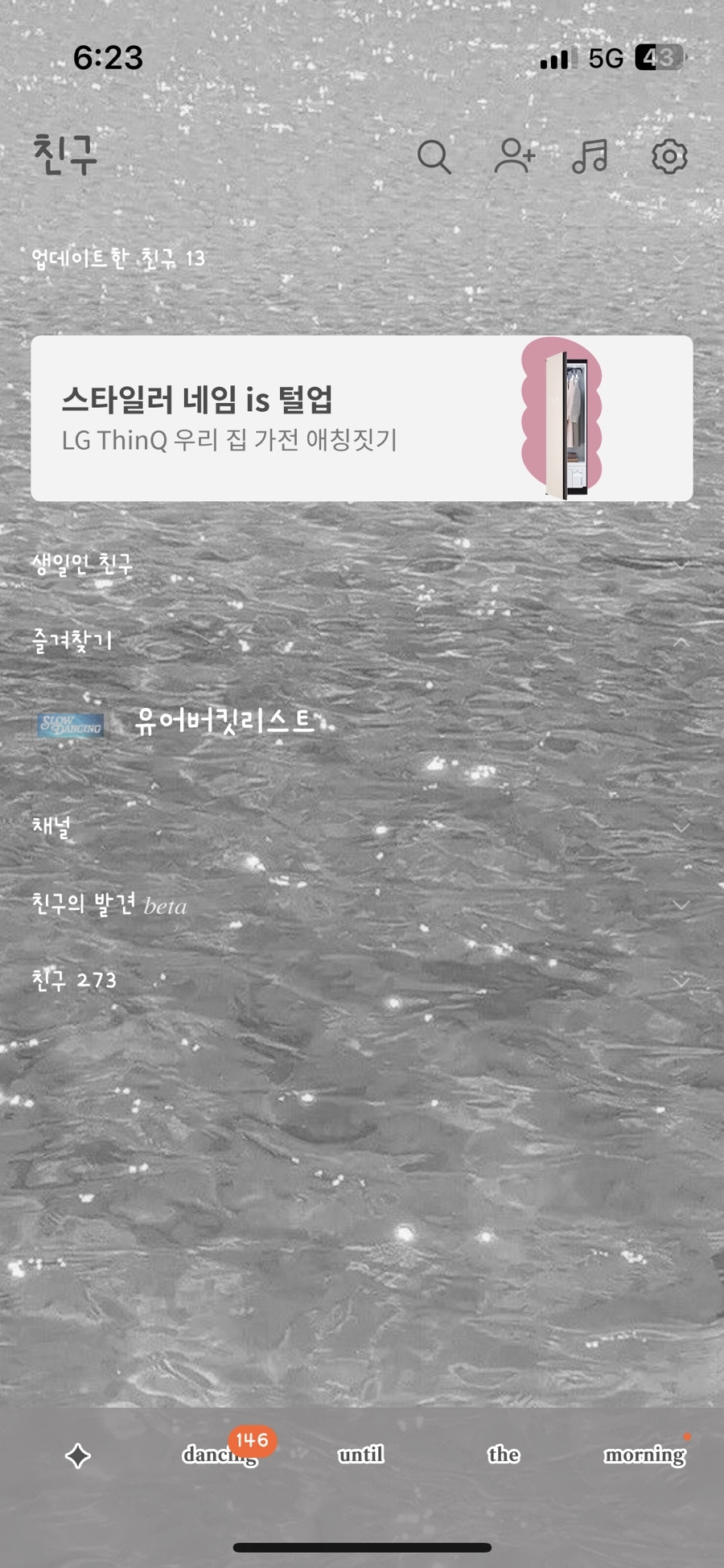 🗯️ 밝은 다크 계열의 물빛 배경이고 하단탭은 Slow dance 가사 한 소절을 넣었어요.