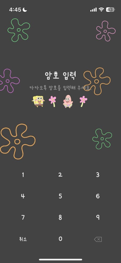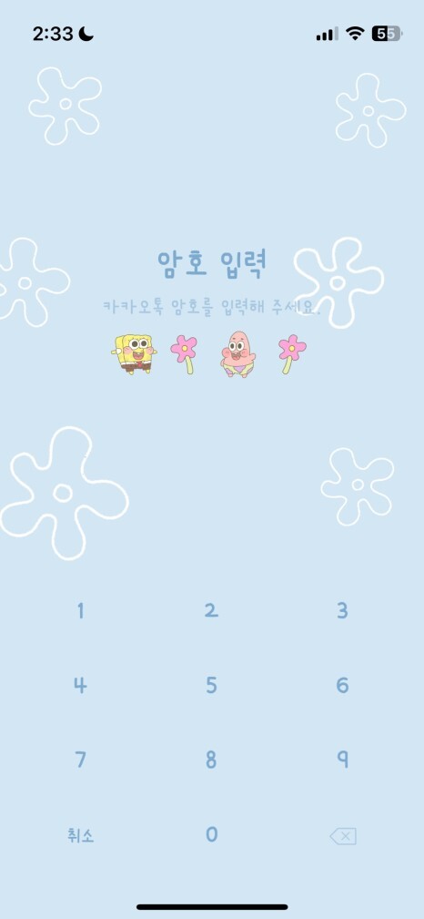 테마 배경 종류는 3가지 색상이고 암호 입력 아이콘은 스폰지밥-꽃-뚱이-꽃 모두 동일합니다.