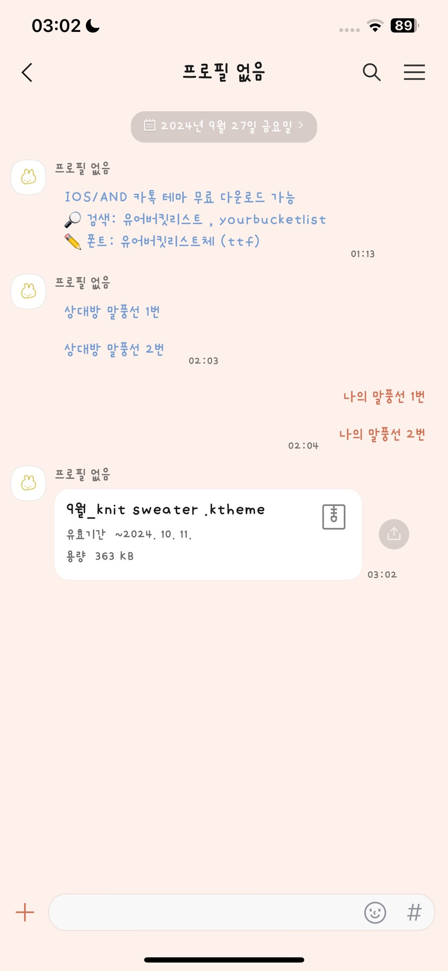 안녕하세요. 5개월만에 새로운 테마 공유합니다! 오랜만이라 TMI 남길게요. . . 저는 그동안 육아하면서 반려동물 테마 주문 제작, 협업 카톡 테마 제작들만 하다보니 무료로 공유할 테마 작업할 엄두가 나지 않았어요. T T ㅋㅋ 아기도 엄청 엄청 잘 크고 있고요. @with_youniverse 아기 인스타그램도 있어요! 맞팔 환영입니다 👶🏻 아 ! 그리고 제가 갤럭시로 폰을 바꿨는데요. 제가 만든 예전 카톡 테마들 안드로이드에 설치해보니 말풍선이 너무 커서 손이 잘 안 가더라고요. 말풍선 간격들도 세심하게 다 조절했으니 앞으로는 안드로이드 유저분들도 만족하실 거예요!