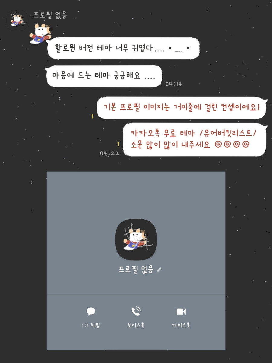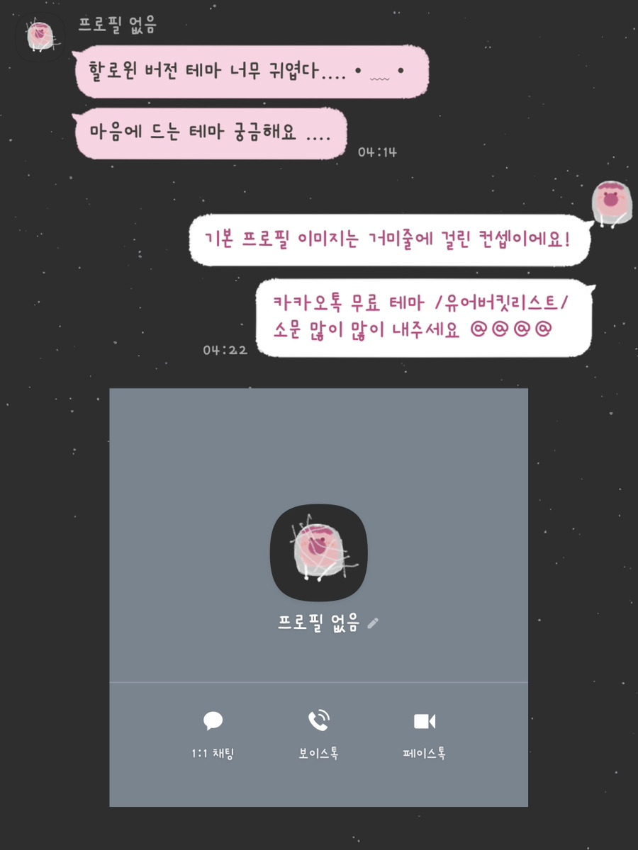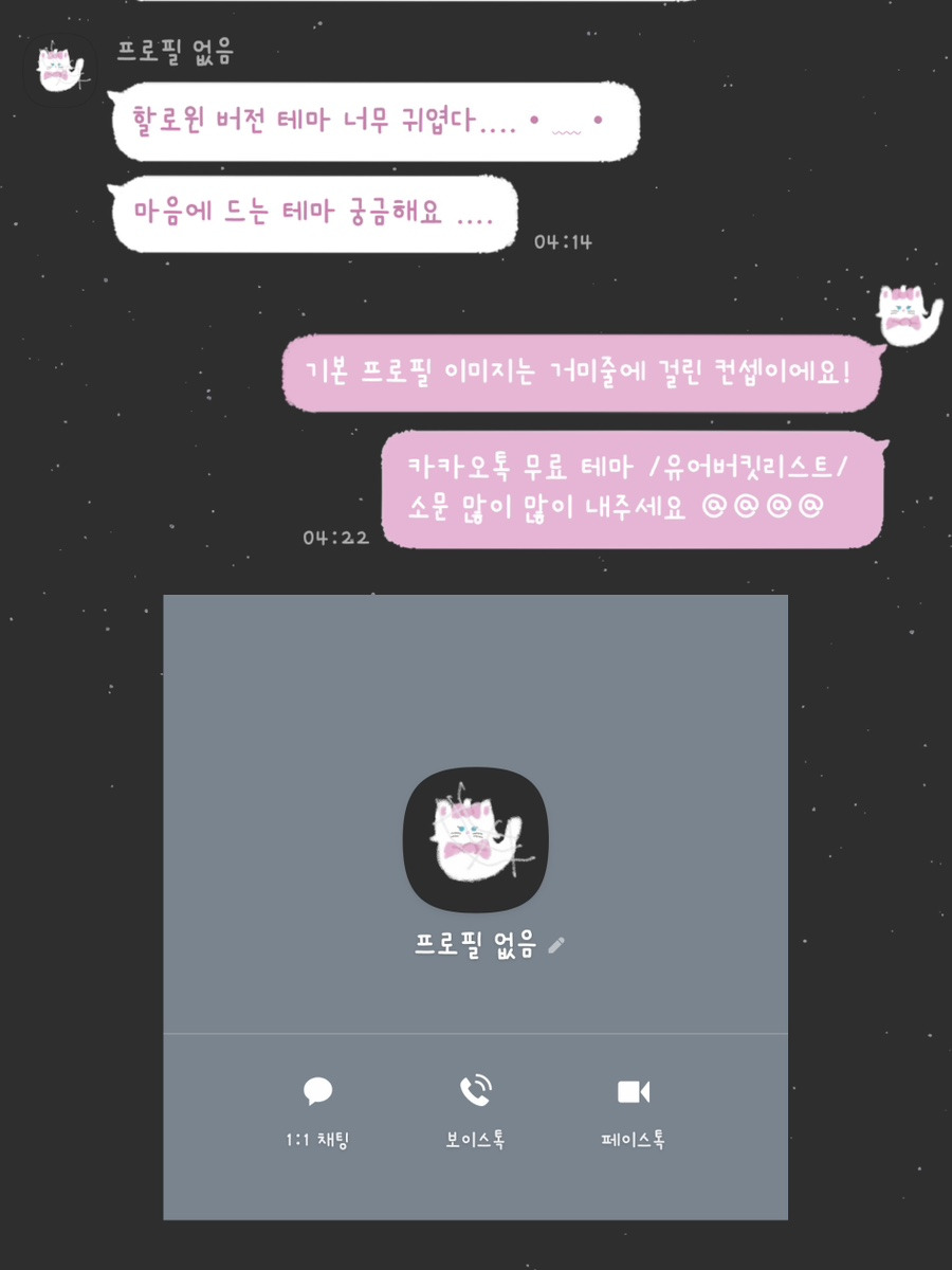 안녕하세요. 인스타그램 스토리로 할로윈 테마 제작하고 있다는 걸 미리 알려드리기도 했는데요. 이번 카카오톡 업데이트가 되면서 아이폰 다크 테마 채팅 입력바 폰트가 안 보이게 되고... 다크 테마를 사용 못한다는 분들이 계셨어요. 그래서 이번에는 모두 다크 테마로 만들왔습니다 ㅎㅎ *이전에 올린 테마 일부는 공유 중단하려고 합니다.