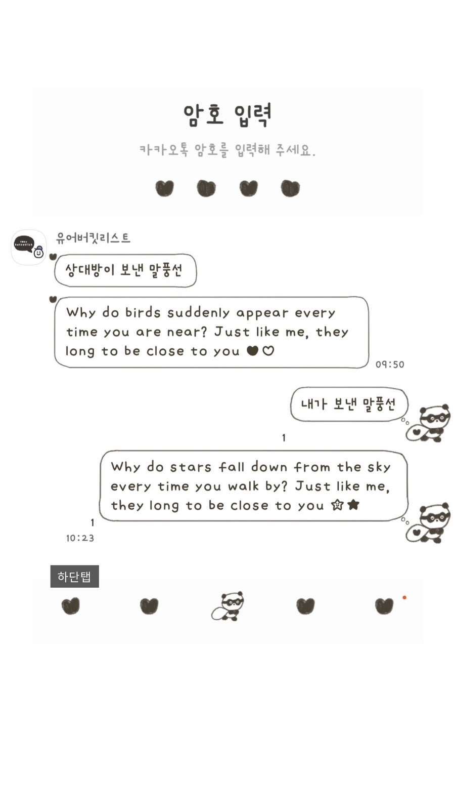 중학교 때 빅뱅 좋아했거든요,, (더이상 줄지 마...) 용돈 모아 간 첫 콘서트도 빅뱅 콘서트... 권지용은 여녜인의 연예인... GD 신곡 해석하고 보면 더 좋답니다?💗 무튼 노래는 파워 넘치지만 카톡 테마는 제 스타일로 귀욤딱지게, ,, 암호입력 아이콘이 나름 귀여워요 🔋