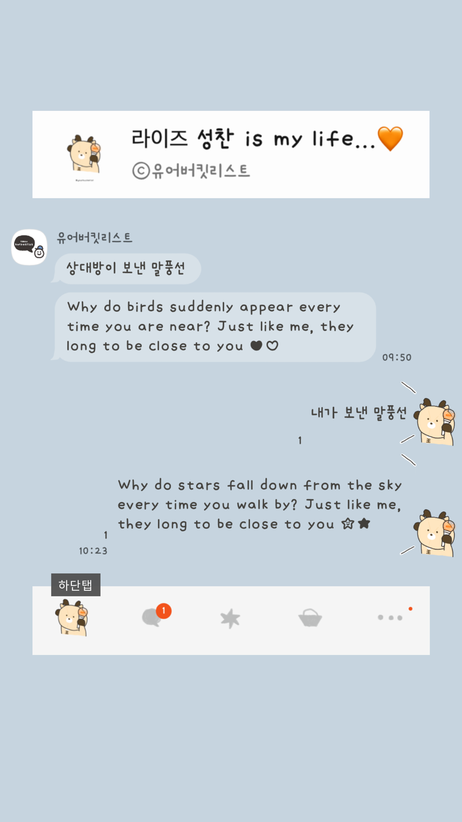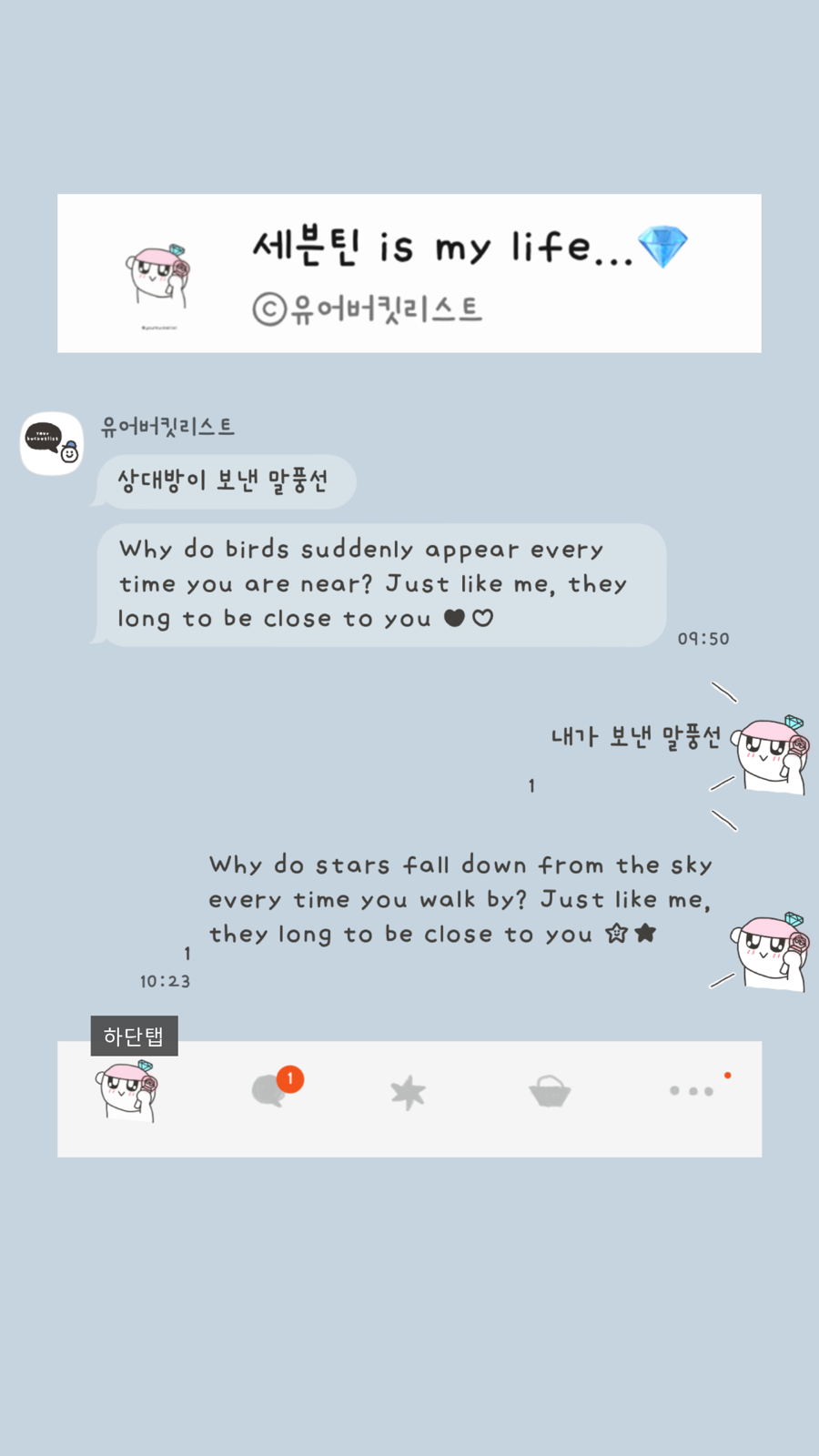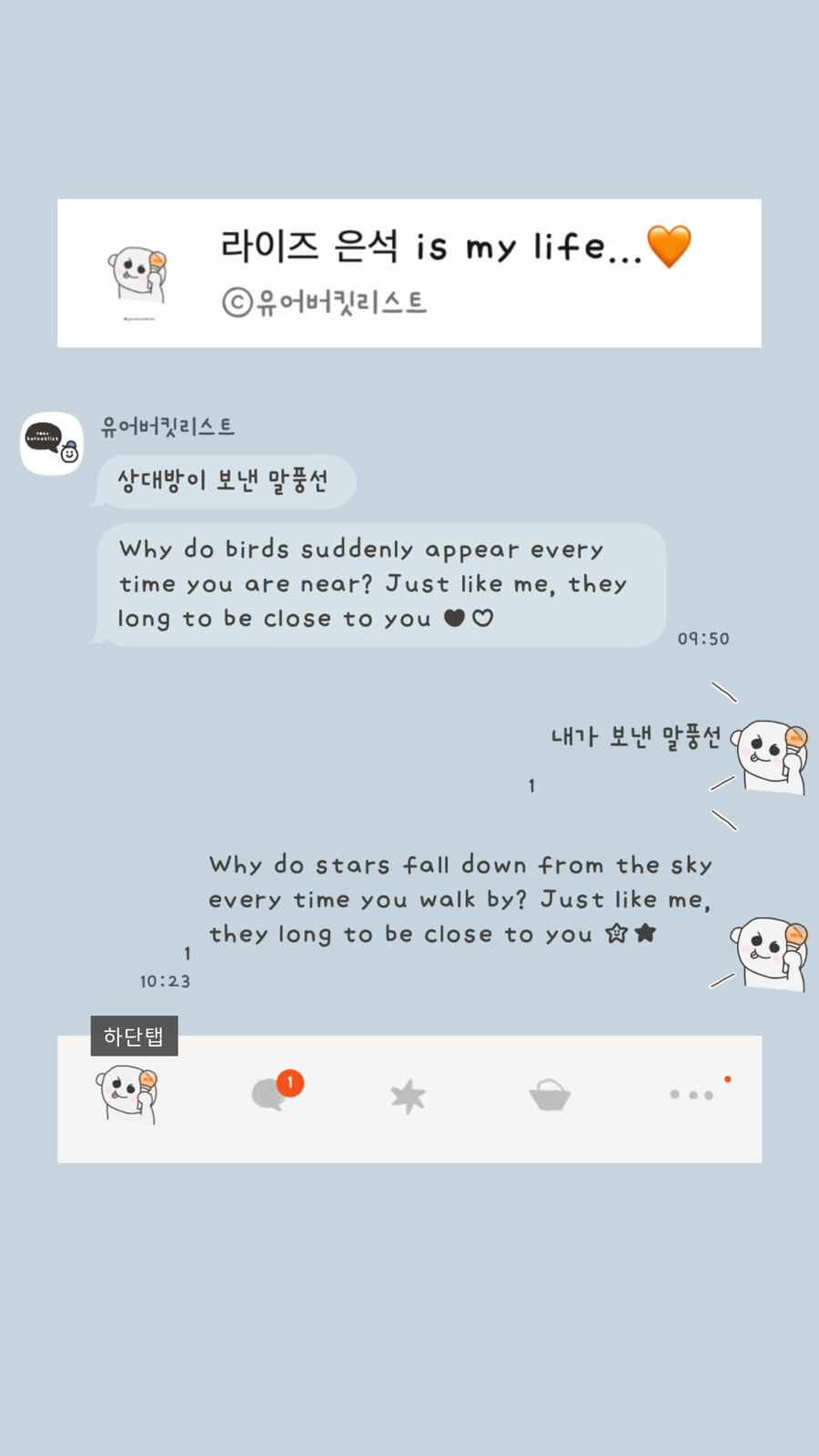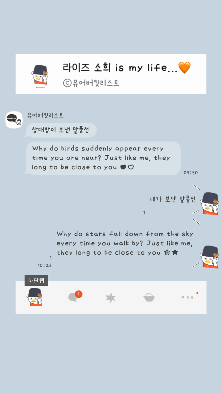 대안을 제시합니다> 앞으로 제가 무료로 배포하는 테마들을 취향에 맞게 변경하고 싶으신 분들은 @카카오톡채널로 문의 주세요! *단, 일러스트 변경 불가/변경 원하는 목록별로 가격 측정. (폰트/배경/말풍선 모양 또는 색/아이콘 컬러...)