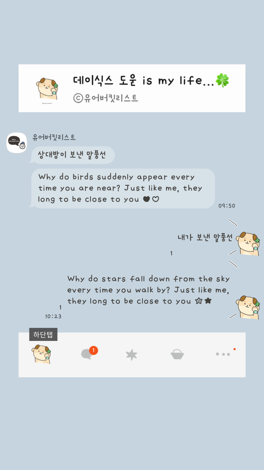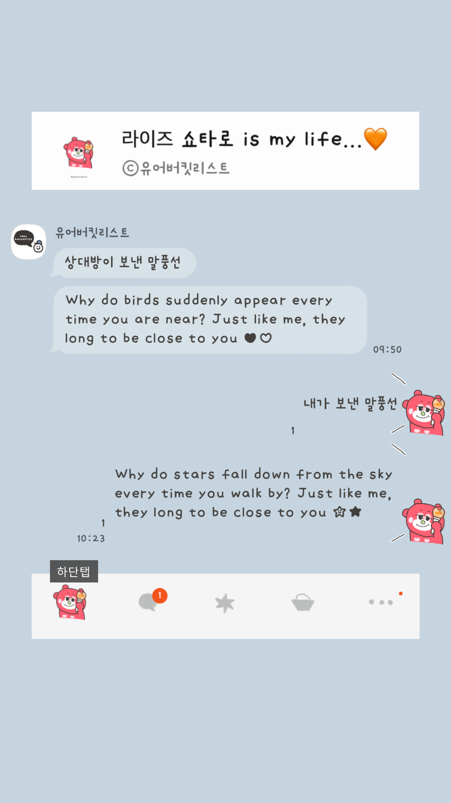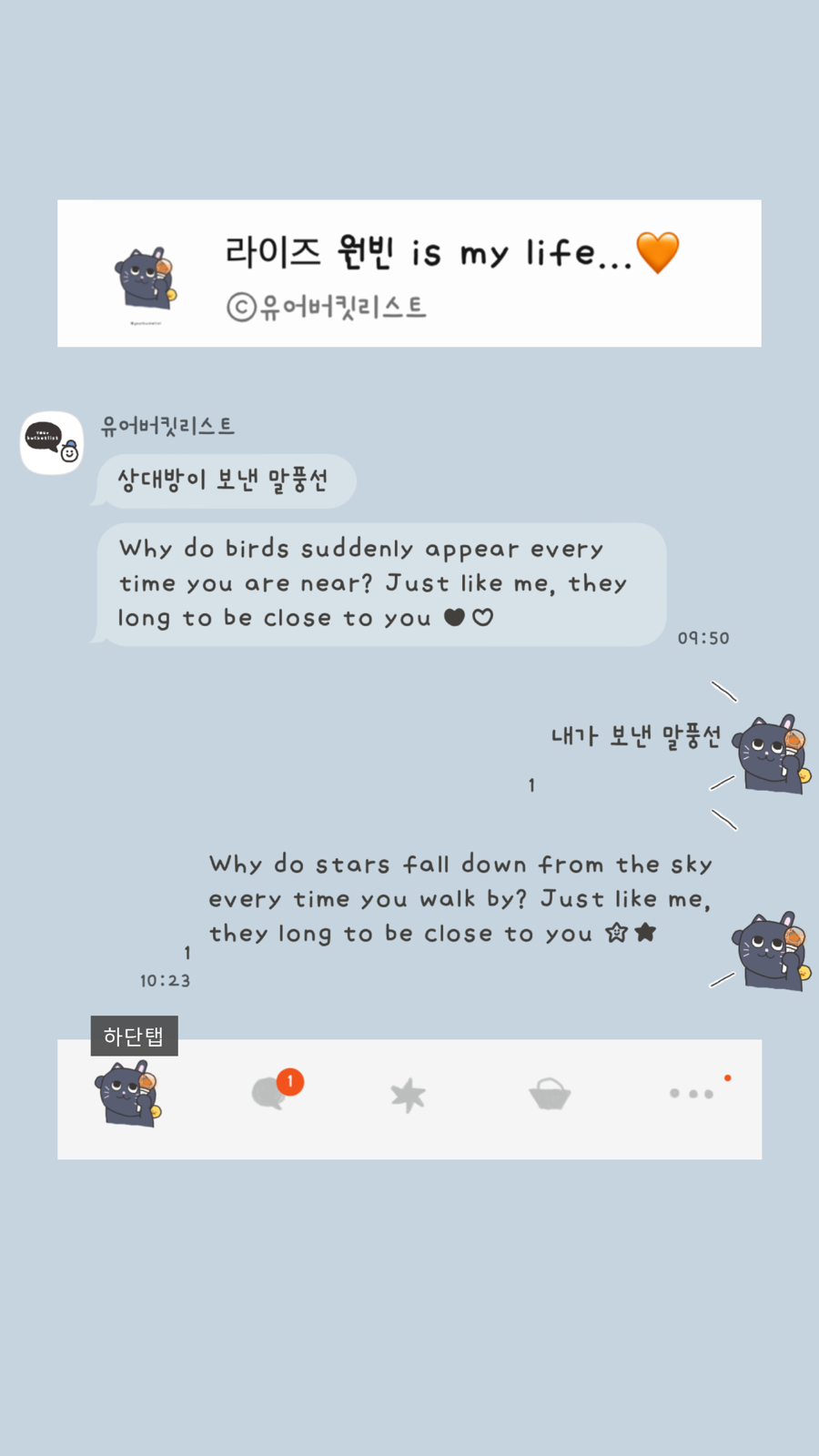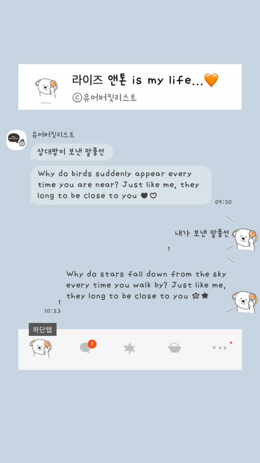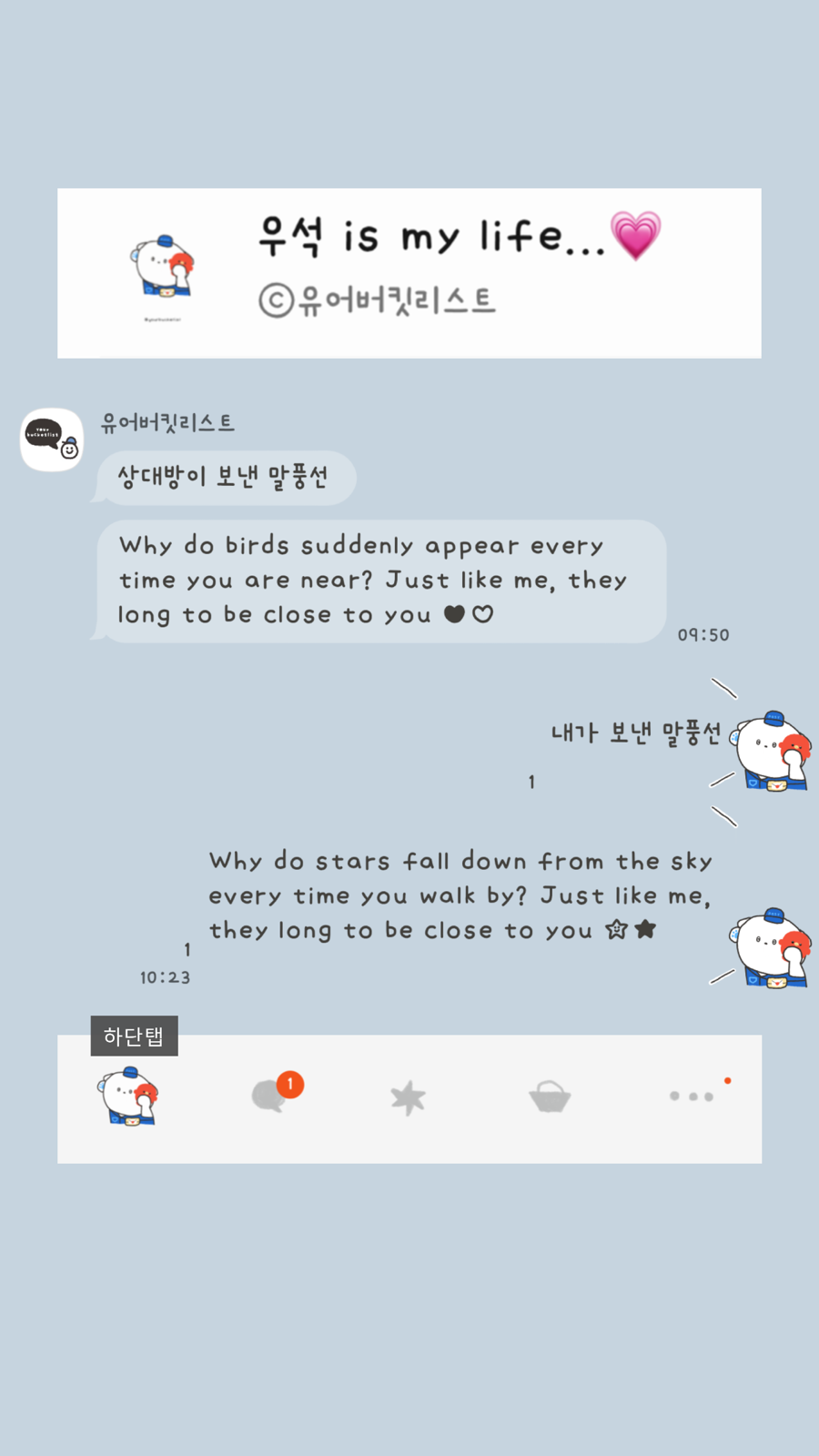 대안을 제시합니다> 앞으로 제가 무료로 배포하는 테마들을 취향에 맞게 변경하고 싶으신 분들은 @카카오톡채널로 문의 주세요! *단, 일러스트 변경 불가/변경 원하는 목록별로 가격 측정. (폰트/배경/말풍선 모양 또는 색/아이콘 컬러...)
