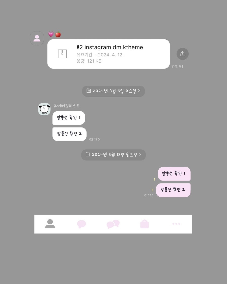 월간 테마를 다들 좋아해주셔서 감사합니다. 게시글마다 보너스 카톡 테마를 일정 기간동안 공유하고 있는데요. 기간이 지나 받지 못 하신 분들의 댓글 및 디엠 요청이 많았습니다. 다운로드 받지 못하신 분들은 아쉬워하지 마시고 재공유 기간에 꼭 다운로드 받아 사용해보시길 바랍니다. 🥰 공유 기간이 끝나면 게시글은 유지하되 첨부한 파일은 삭제합니다.