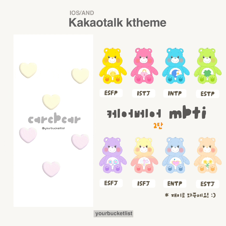 적용 폰트 By 설탕고딕 [폰트 크기 2번째 칸에 맞춰서 사용] 아이폰 : 사파리 앱으로 블로그 접속하기- .ktheme 파일 꾹 누르신 후 카카오톡 나에게 보내기 - 적용 안드로이드 : 하단 링크 접속 후 (AND) 파일 클릭하기 - 무시하고 설치 반복 - 적용 ​ ​ 위의 방법이 안 될 경우 현재 페이지 링크 복사 후, 새 창 열어서 다시 접속 바랍니다. 그래도 안 될 경우 직접 검색 부탁드립니다 🎀 케어베어 MBTI 시리즈 2탄입니다! 케어베어 2탄은 입체 하트 배경 + 테마마다 색이 달라요! 곰들이 비슷비슷한 색들이어서 1탄과 다르게 제작했습니다. 그리고 ISFJ 는 그램베어라고 할머니 곰이었는데 더 예쁜...? 색과 비슷한 성격을 가진 케어베어로 바꿨습니다 🙋🏻‍♀️ ​ 원래 좋아하셨던 분들은 ..