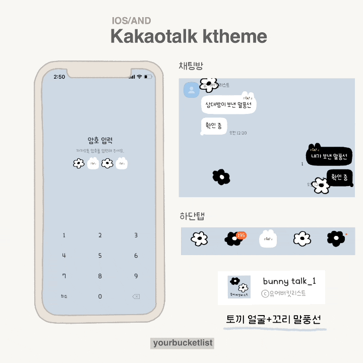 / 연애의 참견 카카오톡 테마로 나온 테마... 두 눈 흙이 들어와도 내가 만든 테마... 사연자분 덕분에 티비에도 나왔어요,,🎁 + ( 240107_수정사항 ) 1. 안드로이드 오픈채팅 탭 버전 업데이트 2. 파스텔 배경 색상 추가해서 올립니다! ♥ ♥ ♥ ♥ 여러분......🙋🏻‍♀️ 2023 새해 복 많이 받으세요. 계묘년 너무 좋아요 ❤ (tmi)뉴진스 노래도 너무 좋고요 ! 기본 배경 색상에 꽃무늬 포인트만 넣었어요. 귀여운 토끼 테마 사용해 보세요.....ᐟ.ᐟ [ 꽃 배경 이미지 파일 필요하신 분 저장하시면 됩니다.] 암호 입력 화면 bunny talk 1,2 동일 하단탭 bunny talk 1,2 동일 bunny talk - 1 토끼 얼굴 + 토끼 꼬리 말풍선입니다. 시간(분)단위가 바뀌기..