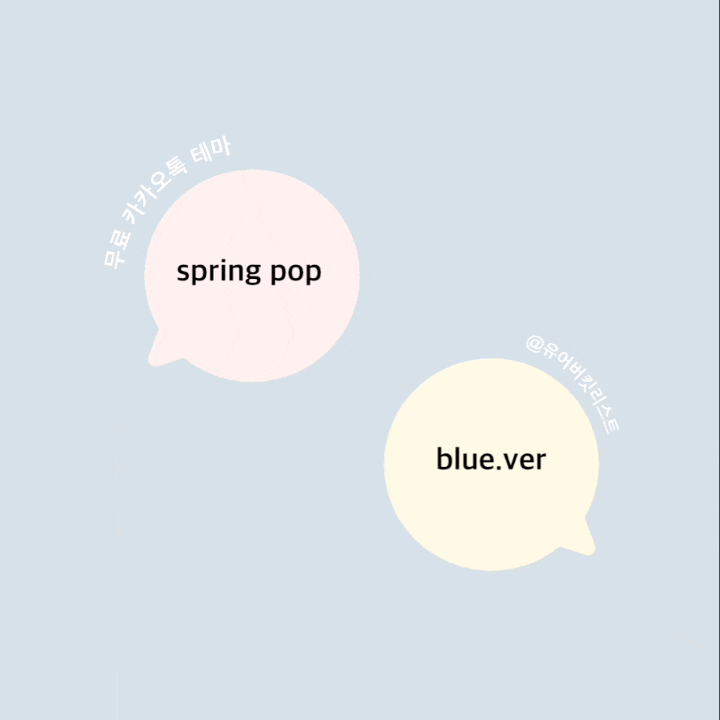 테마 적용폰트 : Aa 합정산스 ​ 아이폰 : 사파리 앱으로 블로그 접속하기- .ktheme 파일 꾹 누르신 후 카카오톡 나에게 보내기 - 적용 안드로이드 : 하단 링크 접속 후 (AND) 파일 클릭하기 - 무시하고 설치 반복 - 적용 ​ ​ 위의 방법이 안 될 경우 현재 페이지 링크 복사 후, 새 창 열어서 다시 접속 바랍니다. 그래도 안 될 경우 직접 검색 부탁드립니다 🎀 3월 한 달도 잘 보내셨나요? 스프링 팝 (블루/그린/핑크/샌드) 심플한 테마 버전으로 만들었어요. (• ̫•)⋆.· 블루/그린은 파스텔 색감이고 핑크/샌드는 차분한 색감입니다. 1 2 3 4 예쁘게 쓰세용! 보고 계신 페이지에서 카카오톡 테마 다운로드 카테고리를 누르시면 다양한 무료 카카오톡 테마를 확인하실 수 있습니다.