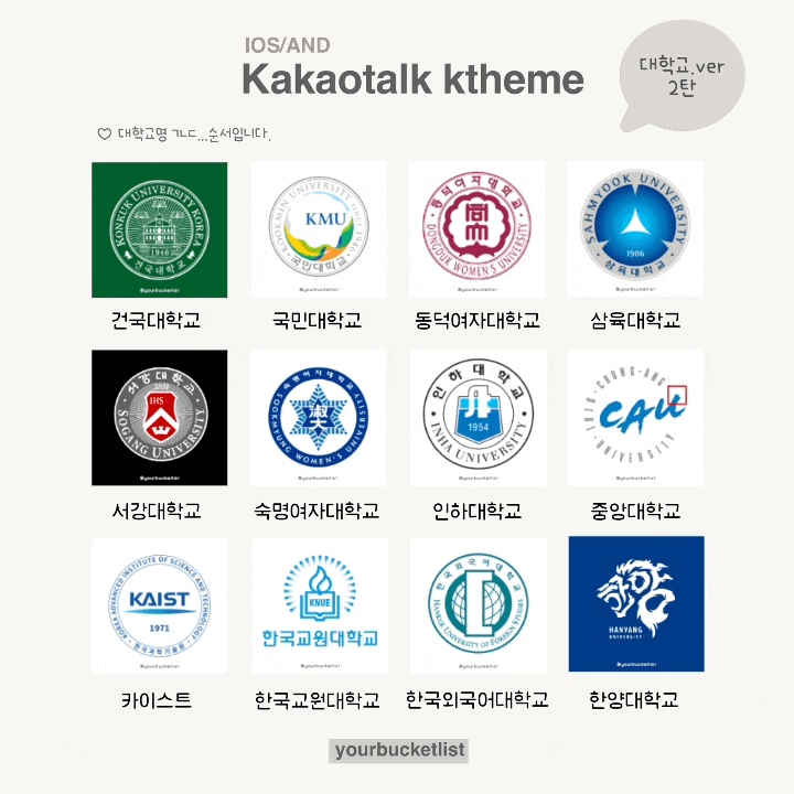/ ​ 적용 폰트 프리텐다드 Regular (우 기울기ver) 아이폰 : 파일 꾹 누르신 후 카카오톡 나에게 보내기 - 적용 안드로이드 : 파일 누르신 후 다운로드 - 무시하고 설치 반복 - 적용 위의 방법이 안 될 경우 현재 페이지 링크 복사 후, 새 창 열어서 다시 접속 바랍니다. 그래도 안 될 경우 직접 검색 부탁드립니다 🥯 1탄에서 댓글 언급 및 댓글 하트(공감) 많은 대학 기준으로 2탄 제작했습니다. 기존 댓글에 언급하신 대학교들도 모두 메모장에 적어두었습니다...(약 40개 정도??) 많이 좋아해주셔서 놀랐어요 👩🏻‍🎓 무튼 수능 기간 전까지 시간만 된다면 또 부지런히 제작해서 올려보겠습니다. . . . (미리보기) (이전 게시글 대학교 카카오톡 테마 1탄 보러가기📤) [IOS/AND] 대학교..