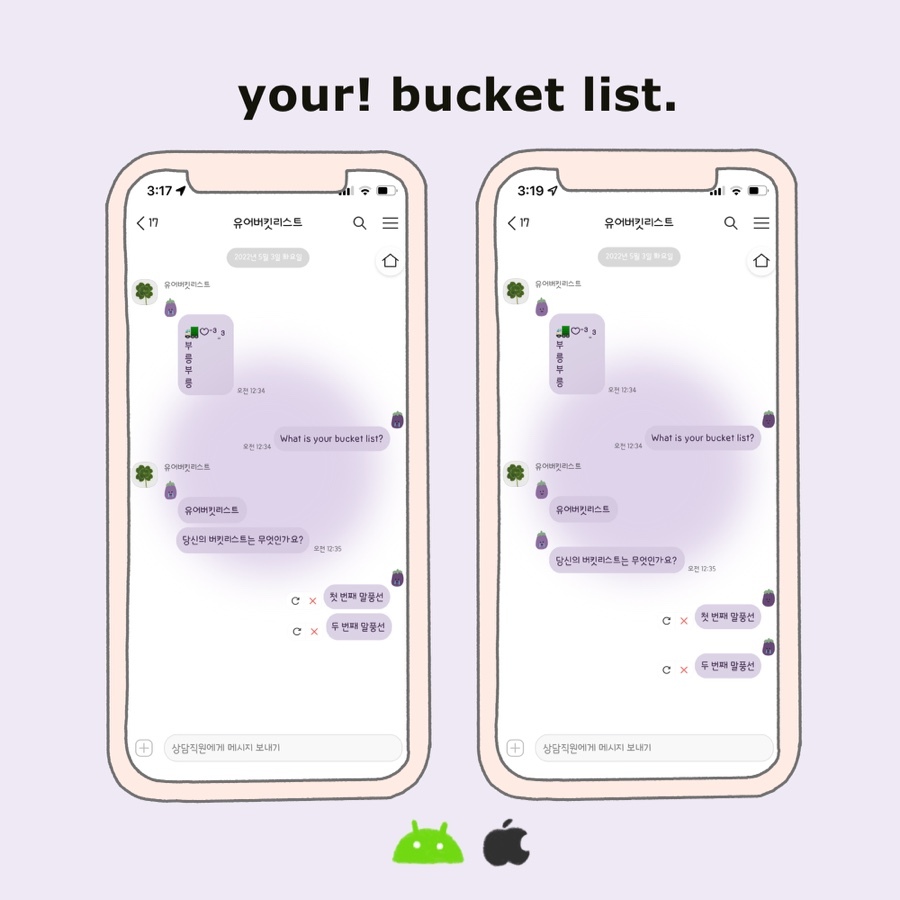 해당 페이지에서는 공유가 끝난 테마를 직접 다운로드하실 수 있습니다. 가지 인형이 우는 거 보고... 귀여워서 카카오톡 테마를 만들게 되었어요. 🥹 / 2가지 버전의 테마 완성했고, 말풍선만 달라요. 하단탭을 클릭하면... 눈물이 조르륵... 감동의 눈물이라고 해석해 주세요..ꉂꉂ ( ˆᴗˆ ) 가지가 울어서 기분 안 좋다는 분들이 몇 계셔서... 당황했습니다! 가지가지 운다 1 ver 우는 가지 일러스트입니다. 가지가지 운다 2 ver 아이폰은 웃다가 우는 가지 반복 일러스트입니다. 안드로이드는 우는 가지만 연속적으로 뜹니다. (수정 불가) ☑️ 재공유하지 말아 주세요. ☑️ 테마 후기 작성 시 출처를 밝혀주세요. ⓒ유어버킷리스트 instagram @yourbucketlist.kr